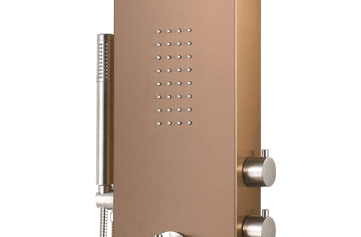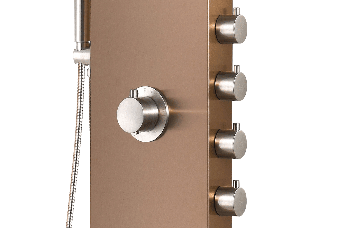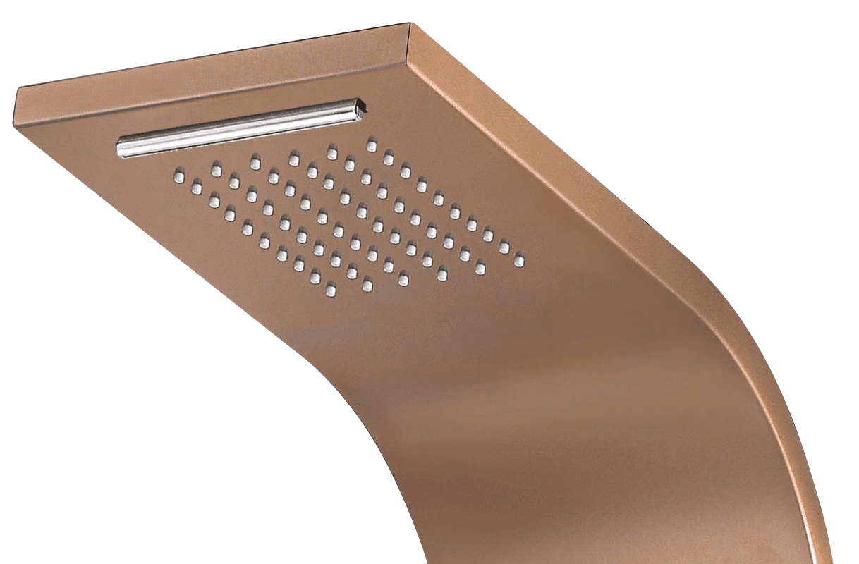 In our Mona shower panel, we have multiplied the number of comfort solutions! A 60-jet tropical overhead shower and 2×32 jets to provide a massage are waiting for you when you choose our product. Its exclusive look is ensured by a bronze stainless steel panel body and 4 separate shower faucets installed on the side of the panel.